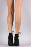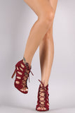 This gorgeous heel features a teardrop cutout design upper, open toe silhouette, and corset-style lace-up closure. Finished with a wrapped stiletto heel and lightly padded insole.