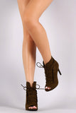 This chic heel features a peep toe silhouette, lace up closure vamp, caged construction with front slit detail, and wrapped stiletto heel. Finished with a lightly cushioned insole and side zipper fastener.