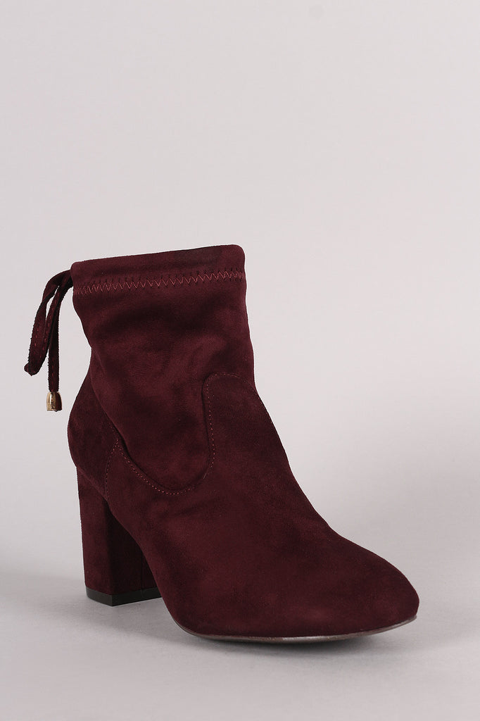 These ankle boots feature a slouchy shaft with stretchy-like material. Top opening has a hidden drawstring bow-tie string, self tie. Round toe. Finished on a chunky heel.