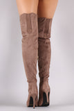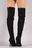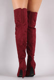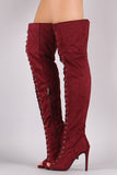 These over the knee boots feature an open toe, micro fiber suede fabrication, elastic lace up front, back elastic gore, wrapped stiletto heel, and a partial zipper for easy on/off.