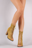 These striking booties feature a geometric cutout design, peep toe silhouette, grommets with corset inspired lace up front, and chunky stacked heel. Finished with a cushioned insole and rear zipper closure for easy on/off.