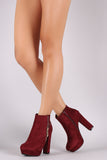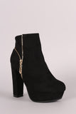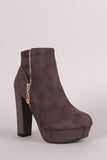 These ankle boots are on an elevated chunky heel and platform; features, a decor outer side zipper and functional inner side zipper. Lightly padded lining.