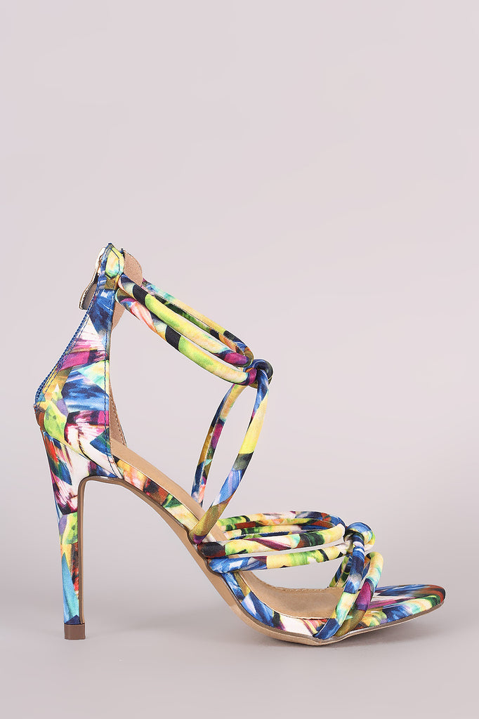 This stunning heel features a kaleidoscope print fabric, strappy construction with knotted detail, and open toe silhouette. Finished with a lightly padded insole, wrapped stiletto heel, and back zip closure.