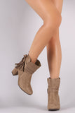 These booties features a soft vegan suede upper, side slits with wrapped around tassel lace tie closure, and covered block heel. Finished with a cushioned insole and smooth lining for all day comfort. Easy pull-on construction with partial side zipper closure for easy on/off.