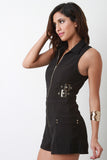This sleeveless romper features a zip up front to a collar neckline, princess seam, side buckle accent, cinched panel seam at waist, side pockets, and fully lined. Accessories sold separately. 95% Polyester, 5% Spandex. Lining: 100% Polyester.
