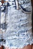 These high waisted denim shorts features a mineral wash, distress holes along front, classic 5-pockets, belt loops, zipper fly, and a single button closure. Accessories sold separately. 95 % Cotton, 5% Spandex.