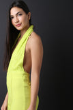 This sassy romper features a deep v neckline, halter top cut, 3 button closure at nape, lace contrast top, high waist cut bottom, pin tuck detailing, invisible zipper closure at back waist. Accessories sold separately. Self: 100% Polyester. Contrast: 90% Nylon, 10% Cotton.