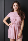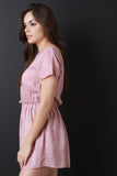 This cute romper features a woven fabrication, wide rounded neckline, loose fit, short sleeves, open style button up back, paper bag elastic a waist and a wide cut short. Accessories sold separately. Made in U.S.A. 100% Rayon.
