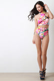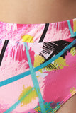 This matching set features a mock neck crop top with racerback design and high waisted brief with wide elasticized waistband. Finished with a paint splash print throughout. Accessories sold separately. Made in U.S.A. 96% Polyester, 4% Spandex.