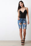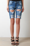 Theses shorts feature a denim fabrication, distressed details, frayed hem, classic 5-pocket design, belt loops with a zipper and single button closure. Accessories sold separately. 98% Cotton 2% Spandex.