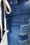 These knee-length shorts feature denim fabric, distressed front and back pockets, elasticized waist with self-tie lace detail, and 4-pocket construction. Accesories sold separately. 100% Cotton.