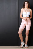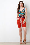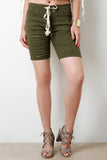 These stylish shorts feature a stretchy knit fabrication, razor-cut details at front and back pockets, 4-pocket design, and elasticized waist band with self-tie lace. Accessories sold separately. 95% Cotton, 5% Spandex.
