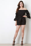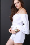 This chic romper features an of the shoulder elastic neckline, three quarter bell sleeves, and elastic waist with a self tie belt and straight leg shorts. Accessories sold separately. Made in U.S.A. 100% Cotton.