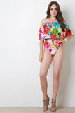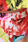 This matching set features a stretch smooth knit with abstract floral prints, off-the-shoulder ruffle crop top, and high waist bikini cut bottoms. Accessories sold separately. Made in U.S.A. 96% Polyester, 4% Spandex.