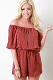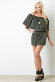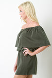 This relaxed-fit romper features an elasticized off the shoulder neckline with ruffled detail and short sleeve construction. Finished with a cinched waistline and short bottom half. Accessories sold separately. Made in U.S.A. 100% Polyester.