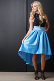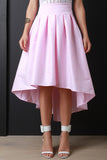 This gleaming high-low skirt is taffeta bodice with a fitted pleated waist. Designed with a hidden side zipper and a self-tie bow belt. Accessories sold separately. Made in U.S.A. 60% Polyester, 35% Nylon, 5% Spandex.
