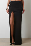 This skirt features a soft stretchy knit fabrication, and elasticized waistband. Finished with a side slit, and maxi length hemline. Accessories sold separately. Made in U.S.A. 95% Polyester, 5% Spandex.