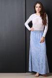 This skirt features acid wash fabric, elasticized crochet waistband, relaxed fit, and maxi length. Accessories sold separately. Made in U.S.A. 100% Rayon.