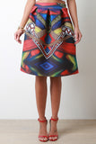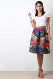 This midi skirt features a geometric print scuba knit fabrication, wide waist band, large box pleated construction, a-line cut, and a straight hem. Accessories sold separately. Made in U.S.A. 92% Polyester, 8% Spandex.