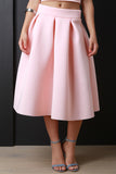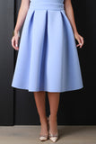 This midi skirt features a neoprene knit fabrication, wide waist band, large box pleated construction, circle skirt cut, and a straight hem. Accessories sold separately. Made in U.S.A. 92% Polyester, 8% Spandex.