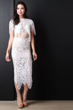 This skirt features a floral crochet lace fabrication with a solid nude underlay, high waist design, scalloped raw hemline, and a side slit. Accessories sold separately. Self: 100% Nylon, Lining: 100% Polyester.