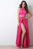 This sexy maxi skirt features a woven knit fabrication, brief underlay, pleated open front slit, and high waisted band. Finished with a rear zipper fastener. Accessories sold separately. Made in U.S.A. 100% Polyester.