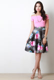 This midi skirt features a knit neoprene fabrication, multi colored floral print pattern, wide waistband, a line skirt silhouette and a raw hemline. Accessories sold separately. Made in U.S.A. 95%Polyester, 5% Spandex.