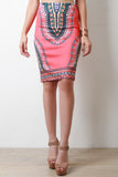 This skirt features smooth stretch fabric, African tribal print, elasticized waist, pencil cut, and midi length. Accessories sold separately. Made in USA. 92% Polyester, 8% Spandex.