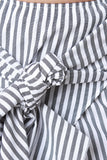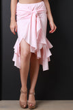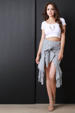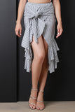This midi skirt features a wrap design, self tie waist, asymmetrical design, ruffle hem, stripe pattern and an invisible side zipper. Woven unlined fabrication. Accessories sold separately. Made in U.S.A. 100% Cotton.