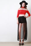 This maxi skirt features semi-sheer mesh, grid pattern, open front, and finished with stretch shorts. Accessories sold separately. Made in USA. 100% Polyester.