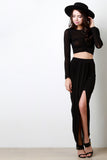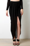 This stylish maxi skirt features a semi-sheer mesh fabric, ruched asymmetrical construction with front draping detail, elasticized waist band, and underlay mini skirt. Accessories sold separately. Made in U.S.A. 95% Polyester, 5% Spandex.