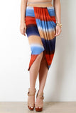 This midi skirt features a jersey knit fabric with multicolored stripe pattern, wide elasticized waist band, and front draping detail. Accessories sold separately. Made in U.S.A. 95% Rayon, 5% Spandex.