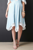 This midi skirt features chambray fabric, elasticized waist, a-line cut, and asymmetrical crochet hem. Accessories sold separately. Outshell: 100% Cotton. Contrast: 100% Polyester.