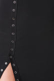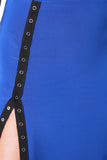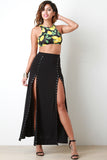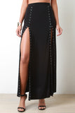 This maxi skirt features a wide elasticized high waisted band, m-slit design, contrasting ribbon trimming and snap buttons. Accessory sold separately. Made in U.S.A. 96% Polyester, 4% Spandex.