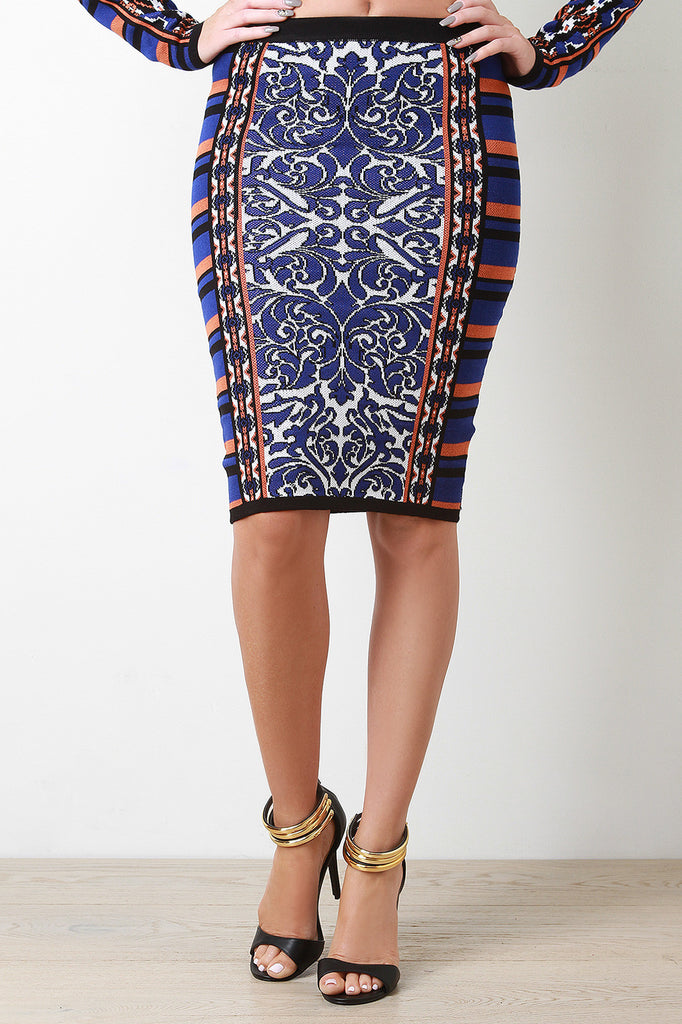 Shop this sweater knit skirt features an elasticized waist, stretchy sculpture fit, damask center design, and striped sides. Accessories sold separately. 75% Viscose, 25% Nylon.