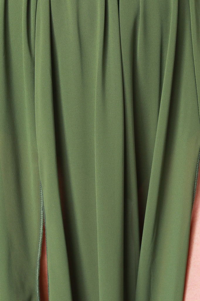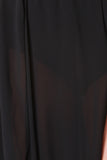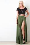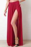 This maxi skirt features semi-sheer chiffon, ruched elasticized waist, double slit front, and brief lining. Accessories sold separately. Made in USA. Self: 100% Polyester. Contrast: 95% Rayon, 5% Spandex.