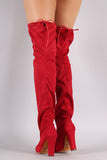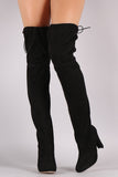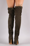 These striking over-the-knee boots feature almond toe silhouette, slightly stretchy vegan suede throughout, and wrapped heel. Finished with a cushioned insole, smooth lining, and tie string closure.