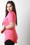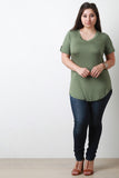 This plus size top features a v neckline, short roll tab sleeves with button accent, single front pocket, and rounded hemline. Accessories sold separately. Made in U.S.A. 95% Rayon, 5% Spandex.