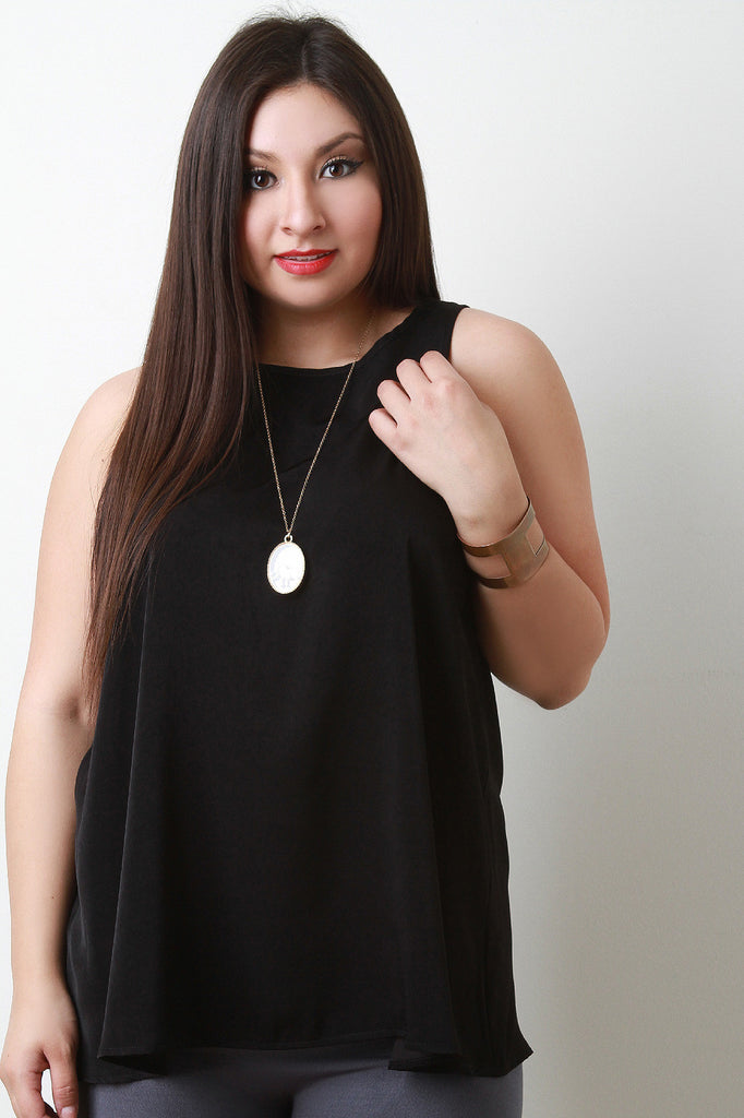 This silky plus size blouse features a round neckline, sleeveless construction, and a relaxed trapeze fit. Finished with a keyhole back and button closure at the nape. Accessories sold separately. Made in USA. 100% Polyester.