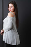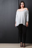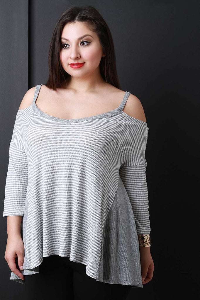 A plus size trapeze striped ribbed knit , and contrasting solid panels at the sides. Accessories sold separately. Made in USA. 95% Rayon, 5% Spandex.