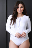 This plus size jersey knit bodysuit features a round neckline with a corset lace-up front, long sleeves, brief bottom, and a double snap button closure at crotch. Accessories sold separately. Made in U.S.A. 95% Cotton, 5% Spandex.