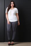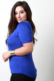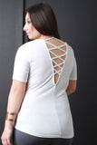This plus size top features a round neckline, short sleeve construction, and jersey knit fabrication. Finished with a detachable necklace and a crisscross design in the back. Other accessories sold separately. Made in U.S.A. 95% Rayon, 5% Spandex.