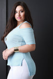 This plus size top features a round neckline, short sleeves with cold shoulder design and ribbed knit fabrication. Finished with a high low hemline and includes detachable necklace. Other accessories sold separately. Made in U.S.A. 48% Polyester, 48% Cotton, 4% Spandex.
