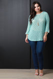This plus size loose knit top features a round neckline, scoopback with razorback underlay and slight high low hemline. Finished with a gold button tab three-quarter sleeves and relax fit. Accessories sold separately. Made is U.S.A. Self: 89% Polyester, 7% Rayon, 4% Spandex. Contrast: 87% Polyester, 10% Rayon, 3% Spandex.
