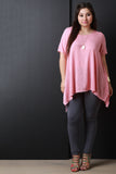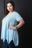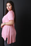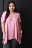 This casual plus size top features a round neckline, short sleeves, hacci knit fabrication and finished with a sharkbite hemline. Accessories sold separately. Made in U.S.A. 62% Rayon, 38% Polyester.