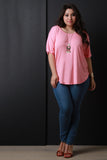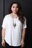 This casual plus size top features a round neckline, halter back, and short sleeves construction. Finished with a jersey knit fabrication and round hemline. Accessories sold separately. Made in U.S.A. 95% Rayon, 5% Spandex.