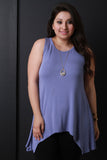 This plus size tunic top features a soft fabrication, round neckline, sleeveless construction, and an asymmetrical sharkbite hemline. Finished with an open back with a strappy accent. Accessories sold separately. 97% Viscose, 3% Spandex.