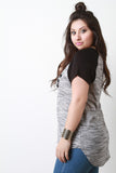 This plus size color block top features fine marl knit fabrication, round neckline, short sleeve construction , print that reads"FLAWLESS" and finished with a high low hemline. Accessories sold separately. 97% Rayon, 3% Spandex.