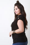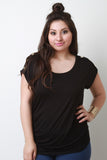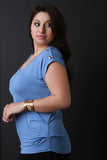 This plus size jersey knit top features a round neckline, short sleeves with triple buttons accent, and gathered sides design. Accessories sold separately. 97% Rayon, 3% Spandex.