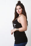 This plus size top features a v-neckline with spaghetti shoulder straps, ribbed knit fabrication, sleeveless and gathered sides. Finished with a print that reads, "I DON'T CARE!!!". Accessories sold separately. 97% Rayon, 3% Spandex.